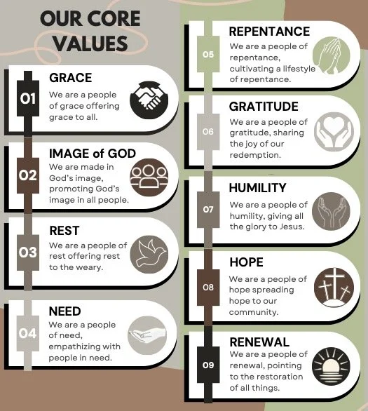 To see people reconciled to God and each other through the message of the gospel and to share the joy, generosity, unity, and freedom of the gospel with our neighborhood.
